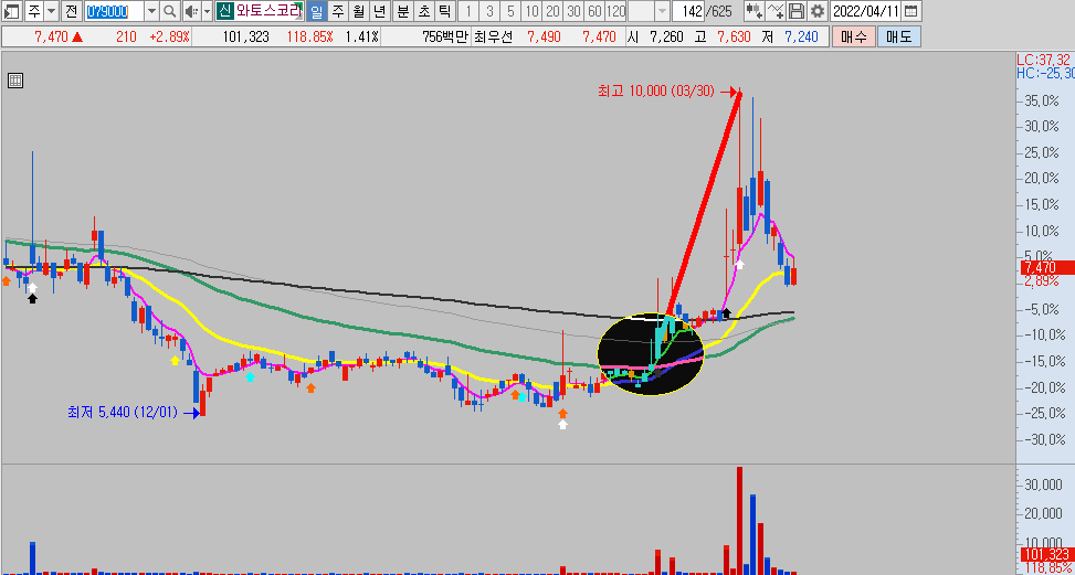 하락후 횡보 흐름을 보이다가, 장기이평을 뚫는 캔들을 발견했다.