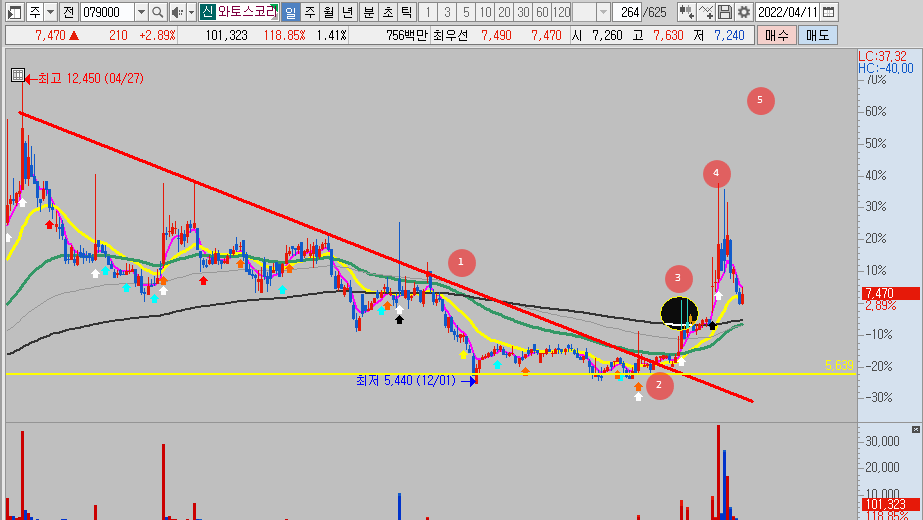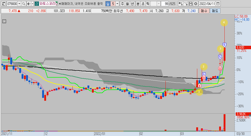 2차예상매수구간까지 눌리지 않고 장기이평을 지지하는 흐름에서 상방슛팅이 나왔다.
